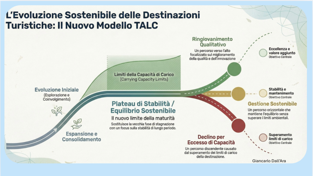 Nell’intervista Butler riflette sulla rilevanza del suo modello TALC (“Tourism Area Life Cycle”) alla luce delle sfide odierne. Una delle revisioni più significative che propone è il cambio di terminologia nelle fasi finali del ciclo. Butler suggerisce di riconoscere che l’assenza di crescita non deve essere vista come un fallimento (accezione negativa di stagnazione), ma come un passo consapevole verso l’equilibrio e lo sviluppo sostenibile. In effetti oggi, anche in altri suoi scritti, Butler sottolinea che per molte destinazioni il raggiungimento di un “plateau” stabile non è un fallimento, ma il segno che si è raggiunta la capacità di carico ottimale.